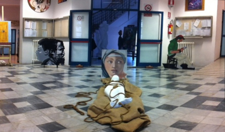 Il progetto si intitola "Profeti dello spazio" e ricalca il titolo di un celebre saggio sull'opera dell'artista Lucio Fontana. L'opera centrale dell'esposizione si rifà difatti a un'opera su tela di Lucio Fontana, dai cui celebri tagli sono stati ricavati dei calchi ideali, delle sculture sospese, a simboleggiare quanto quel gesto di apertura sul vuoto, su di uno spazio sconosciuto, si sia trasformato con l'andare del tempo in un qualcosa di estremamente concreto, influenzando da decenni le arti figurative fino ad arrivare al design contemporaneo. Ancora, sagome con i volti di alcuni importanti "profeti" della cultura italiana, da Dante a Michelangelo fino ad arrivare ad Artemisia Gentileschi e, di nuovo, a Fontana. I ragazzi si sono prestati a dar corpo a queste sagome, attualizzandole, facendosi fotografare mentre dipingono o leggono i messaggi sul loro cellulare: cercando di eliminare così, per un istante, quella distanza e quella soggezione che ci separa da questi grandi esempi, facendo capire che in ognuno di noi si può nascondere la possibilità della creazione e tutti, con lo studio e con l'impegno, possiamo ambire a raggiungere obiettivi sempre più elevati.